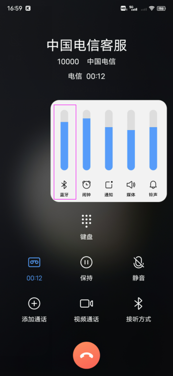 蓝牙设备通话中,按压手机音量键增加音量,音量条下边显示蓝牙图标。