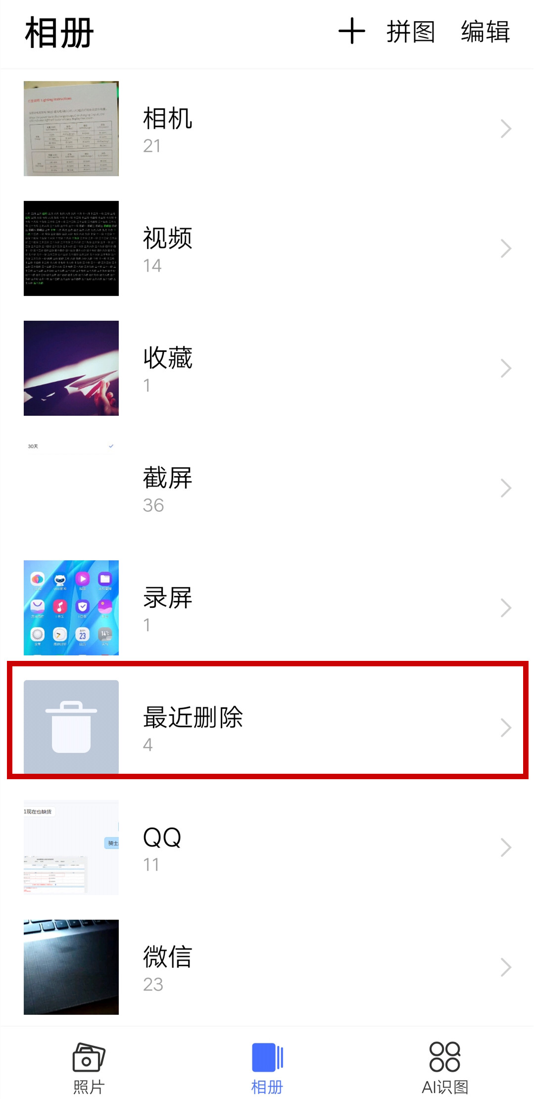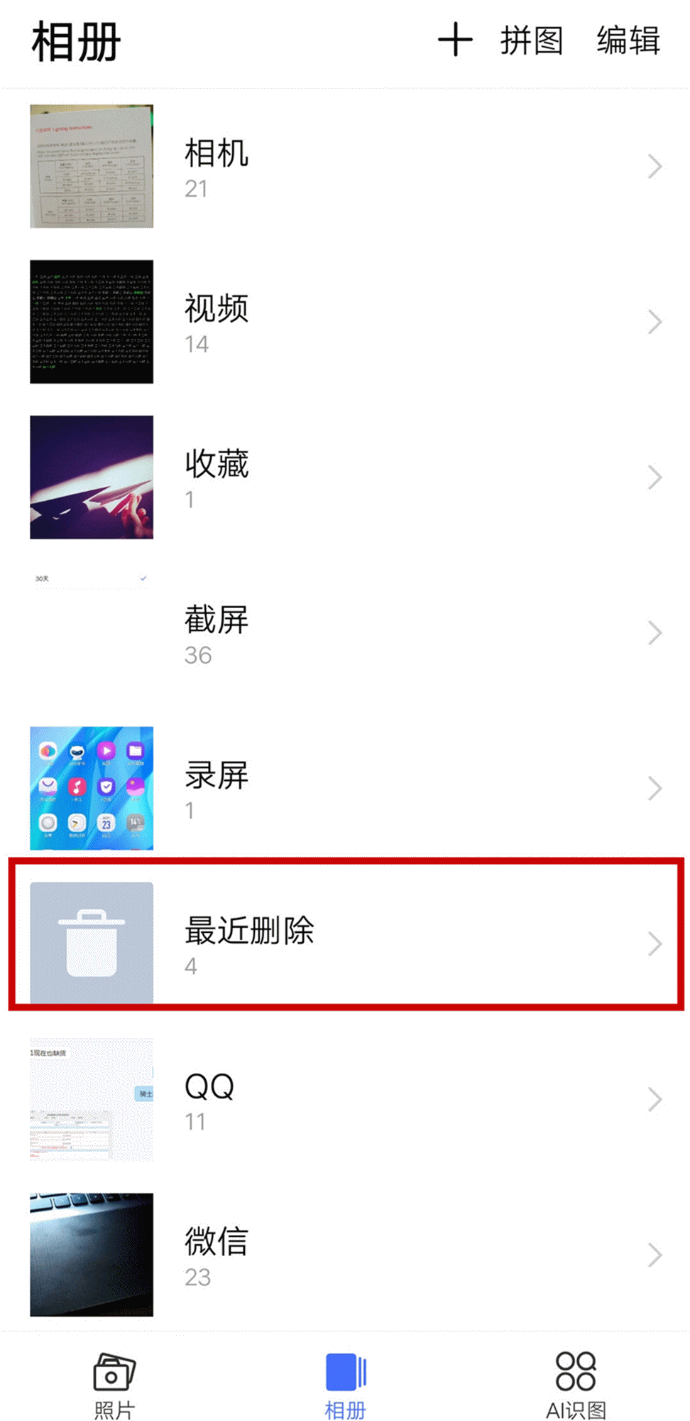 打开相册后,会发现一个显著的变化,就是照片分类中我们可以看到一个全新的文件分类——「最近删除」